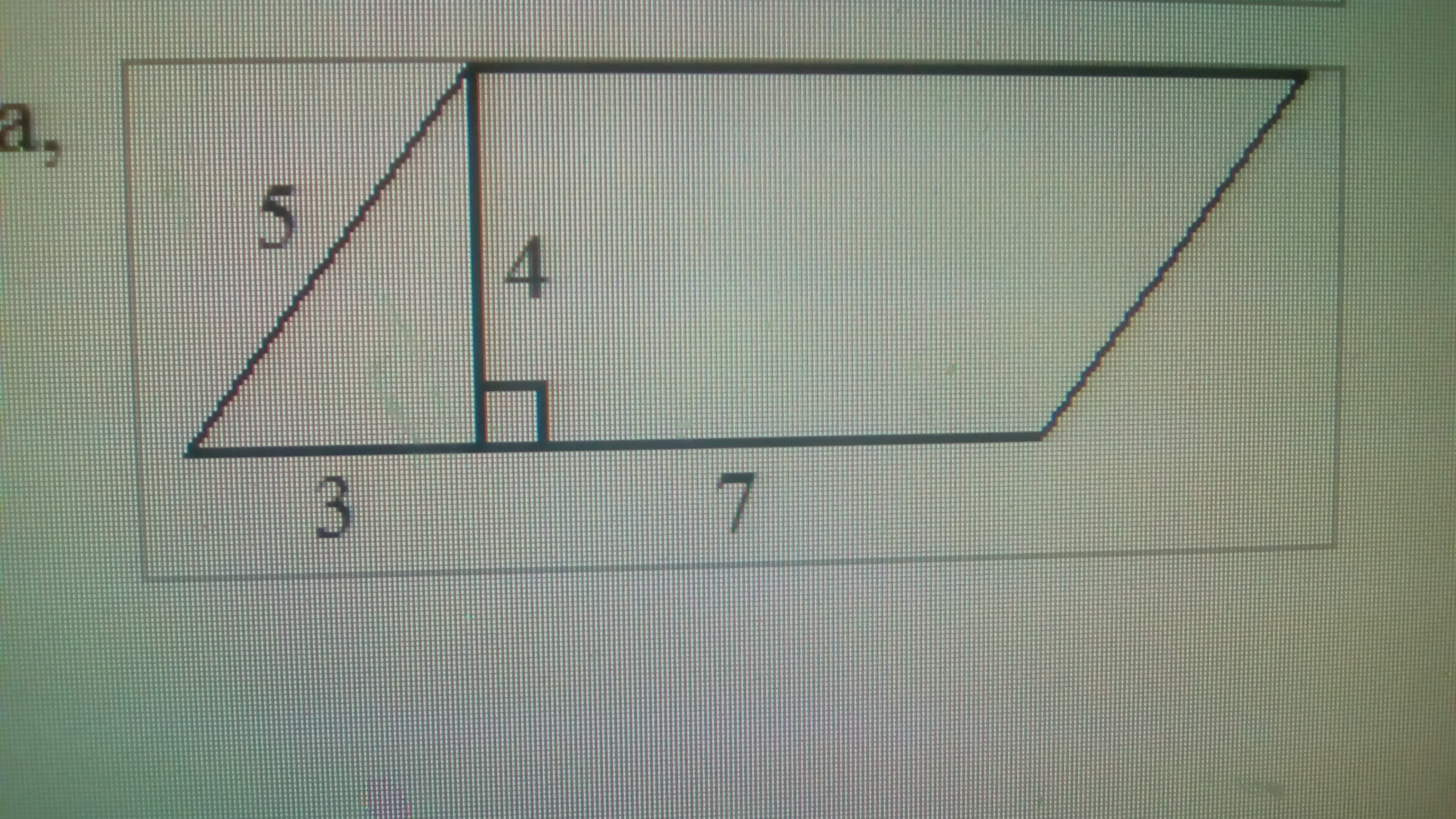Площадь параллелограмма равно основание умноженное на высоту. Чтобы узнать чему равно основание мы к 3 прибавляем 7 итого 10. Высота у нас 4. Следовательно 10 умножаем на 4 итого 40.