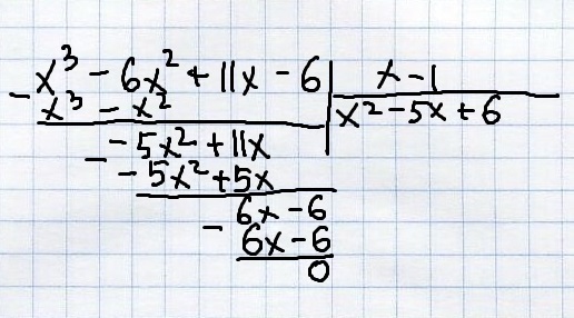 Видим, что в x³-6x²+11x-6=0 корнем уравнения является 1. Разделим данный многочлен на (x-1)