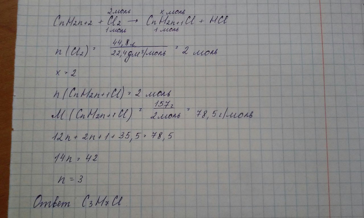 При хлорировании алкана израсходовано 44,8 л хлора и образовалось 157 г галагеналкана. Выведите формулу алкана