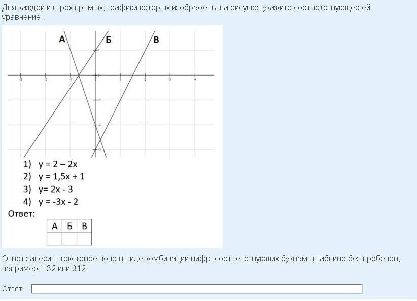 Для каждой из трех прямых, графики которых изображены на рисунке, укажите соответствующее ей уравнение.