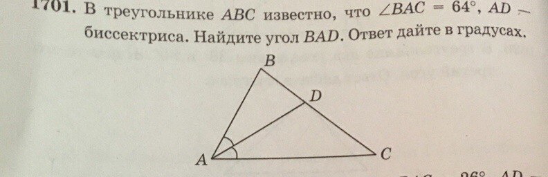 BAC = 64 AD-биссектриса. Если у нас угол равен 64 градусом то BAD будет равен половине 64/2=32.