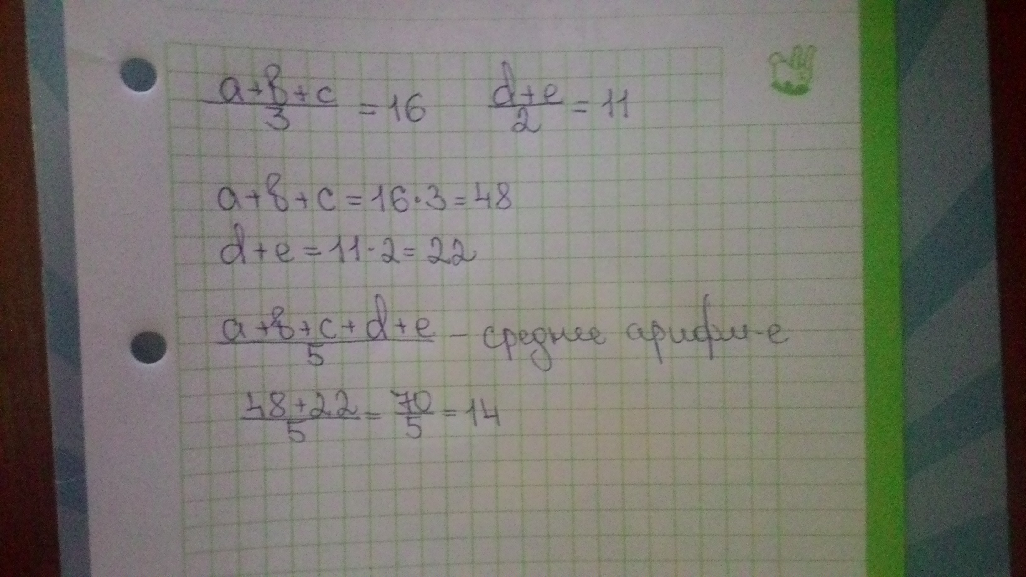 среднее арифметическое чисел a, b и с равно 16, а среднее арифметическое чисел d и е равно 11. найдите среднее арифметическое чисел a, b, c, d, e. Ответ 14, нужно решение