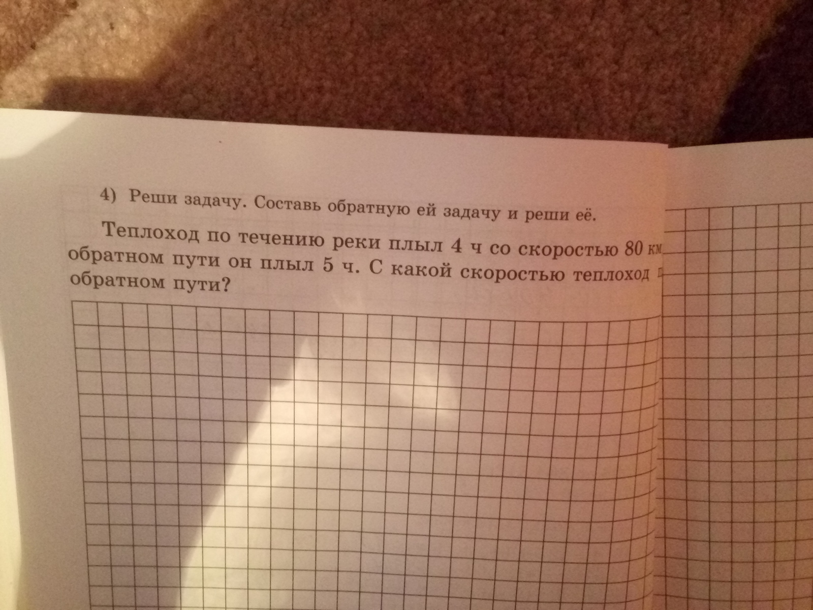 теплоход по течению реки плыл 4 ч со скоростью 80 км / ч а обратном пути он плыл 5 ч с кокой. скоростью теплоход плыл обратном пути. реши задачу составь обратную ей задачу и реши её