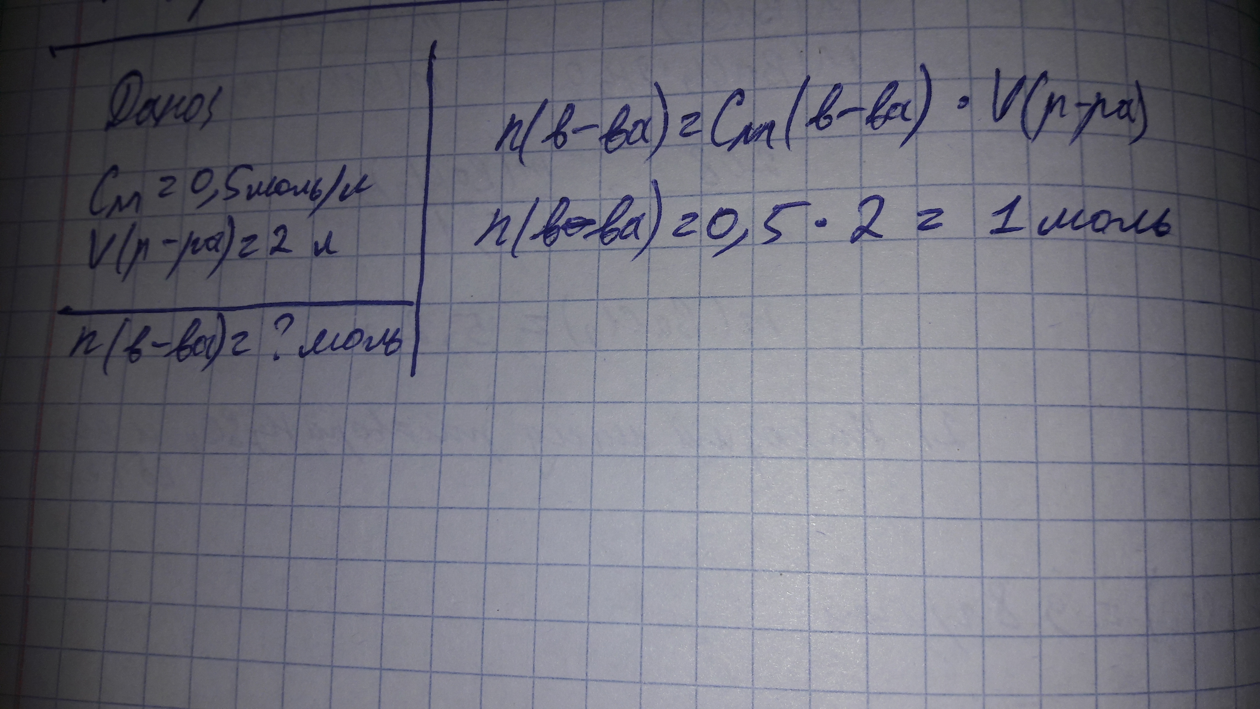 Определите, какое количество вещества содержится в растворе сахара молярной концентрации 0,5моль/л, если обьем раствора 2л.