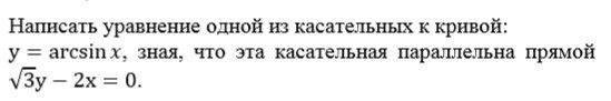 y=arcsinx y'=1/√(1-x²) прямая y=2/√3*x
