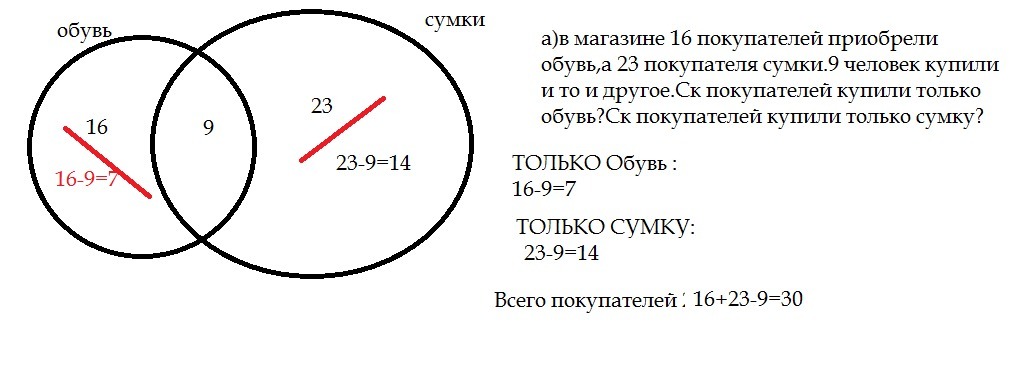 Решите задачи при помощи диаграммы эйлера венны-а)в магазине 16 покупателей приобрели обувь,а 23 покупателя сумки.9 человек купили и то и другое.Ск покупателей купили только обувь?Ск покупателей купили только сумку?