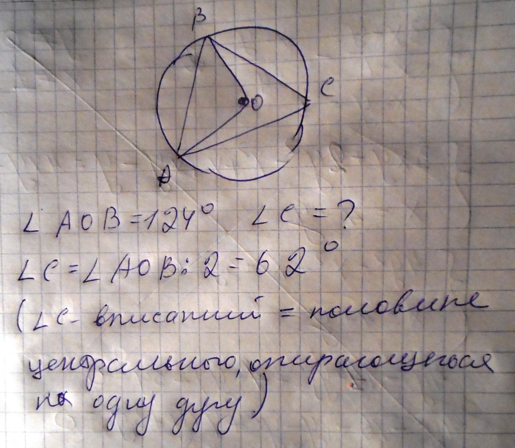 Треугольник ABC вписан в окружность с центром в точке O. Найдите градусную меру угла C треугольника ABC, если угол AOB равен 124