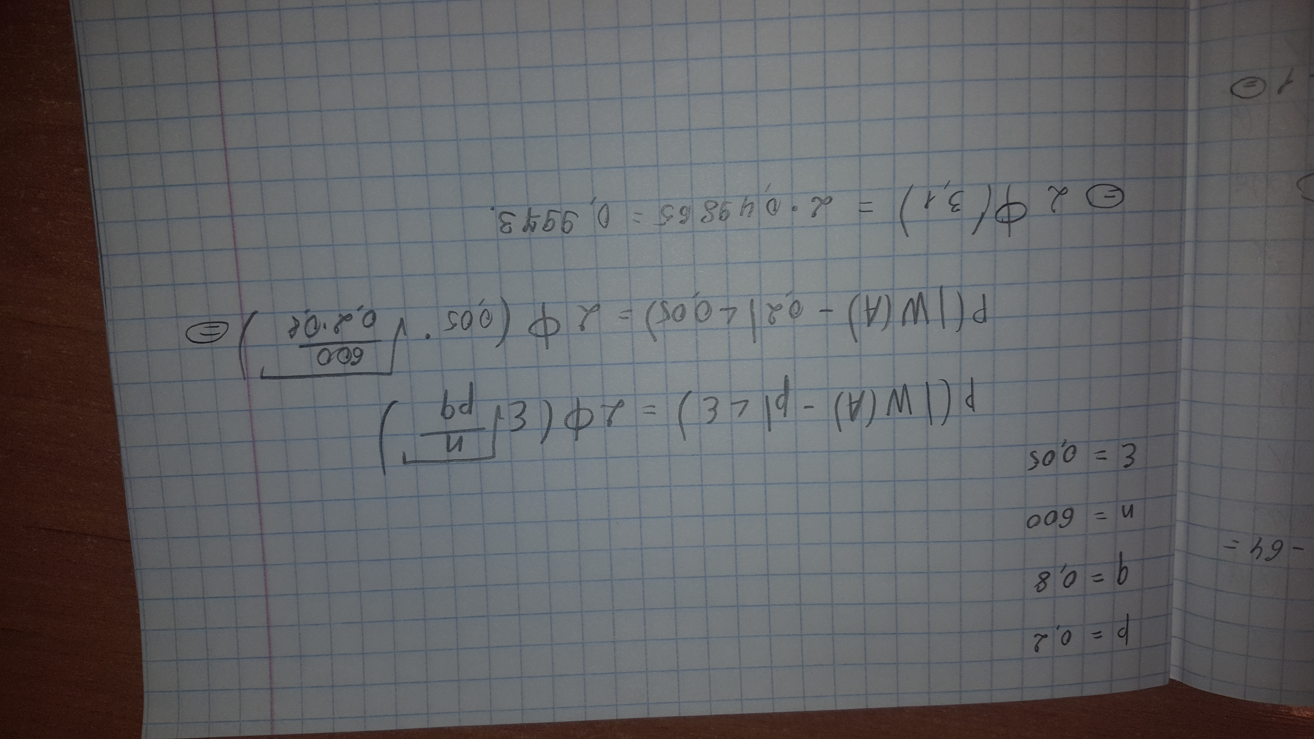 Вероятность того,что наудачу выбранная деталь не стандартна, равна 0,2. Какова вероятность того, что среди случайно отобранных 600 деталей относительная частота отклонится от вероятности появления нестандартной детали по абсолютной величинене более чем на 0,05?