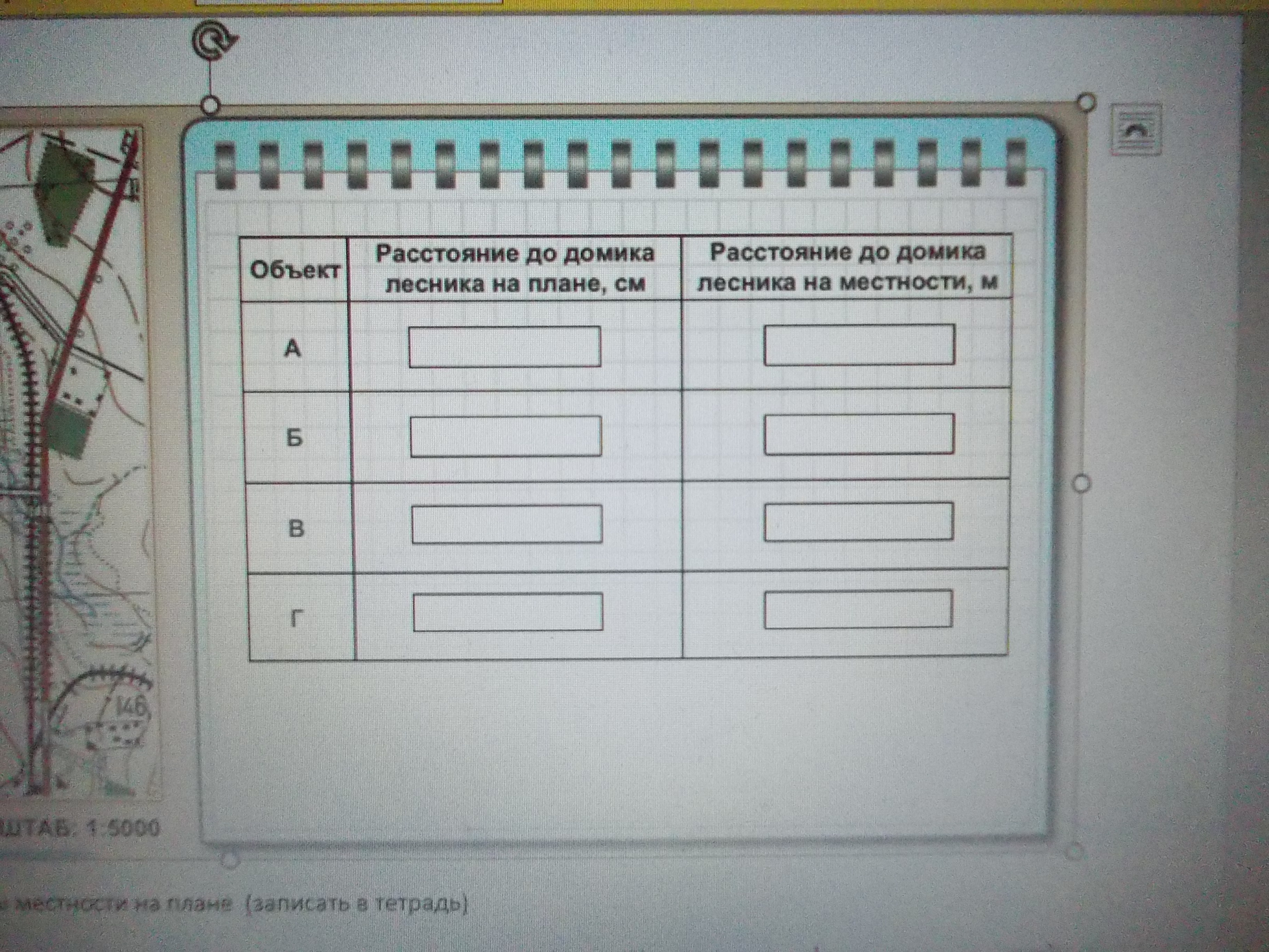 Задание 2. Используя масштаб карты и линейку, определить расстояния от точек А, Б, В, Г до домика лесника (точка О) на плане в см (расстояние на карте) и на местности (реальное расстояние) в м. Записать в виде таблицы.