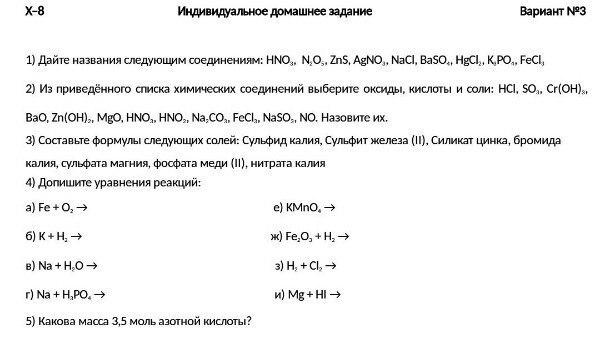 1)азотная кислота, оксид азота 5, сульфид цинка, нитрат серебра, хлорид натрия или поваренная соль, сульфат бария, хлорид ртути, ортофосфат калия, хлорид железа 3