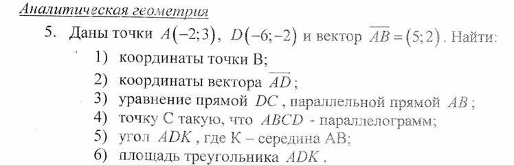 Помогите решить задание по аналитической геометрии, а в частности 5 и, соответственно, 6 пункты.