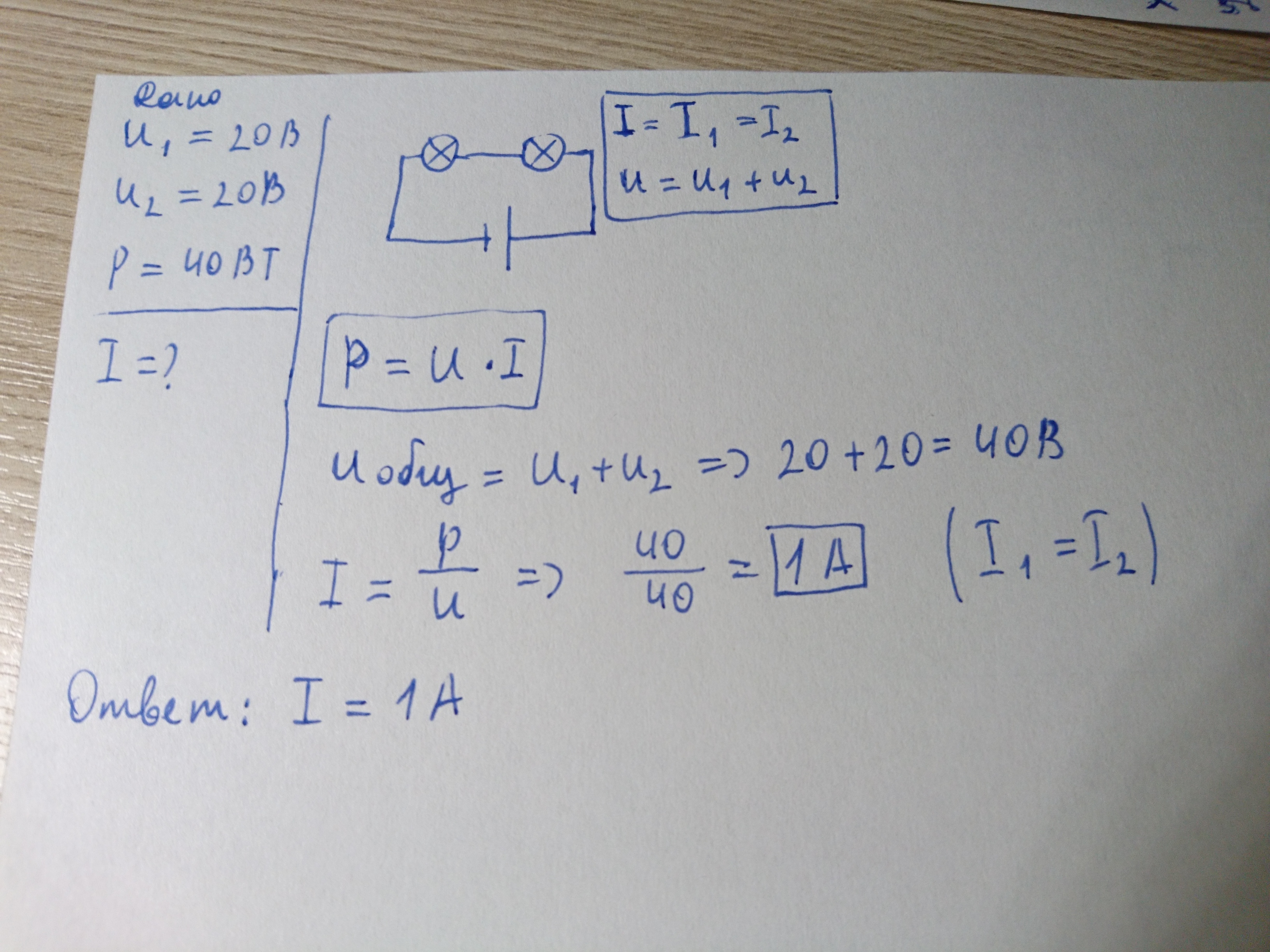 ри последовательном напряжении 2 ламп расчитаных на напряжение 20в,каждая ,мощность тока равна 40 вт .Определите силу тока в цепи