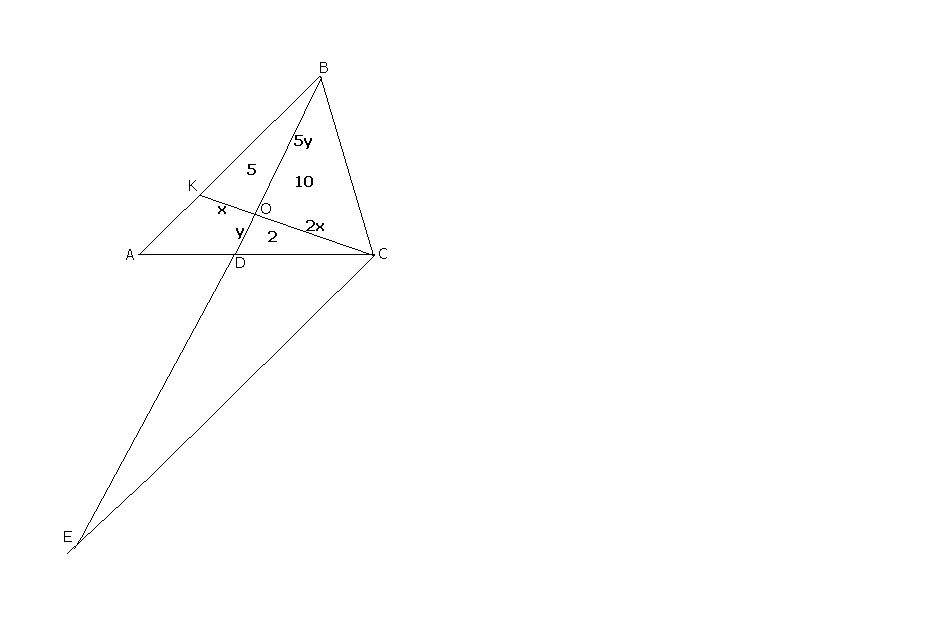 Дан треугольник ABC. Точка K лежит на стороне AB, точка D- на стороне AC. Отрезки BD и CK пересекаются в точке O. Площади треугольников COD, COB и BOK соответственно равны 2, 10 и 5. Найти площадь четырёхугольника ADOK.