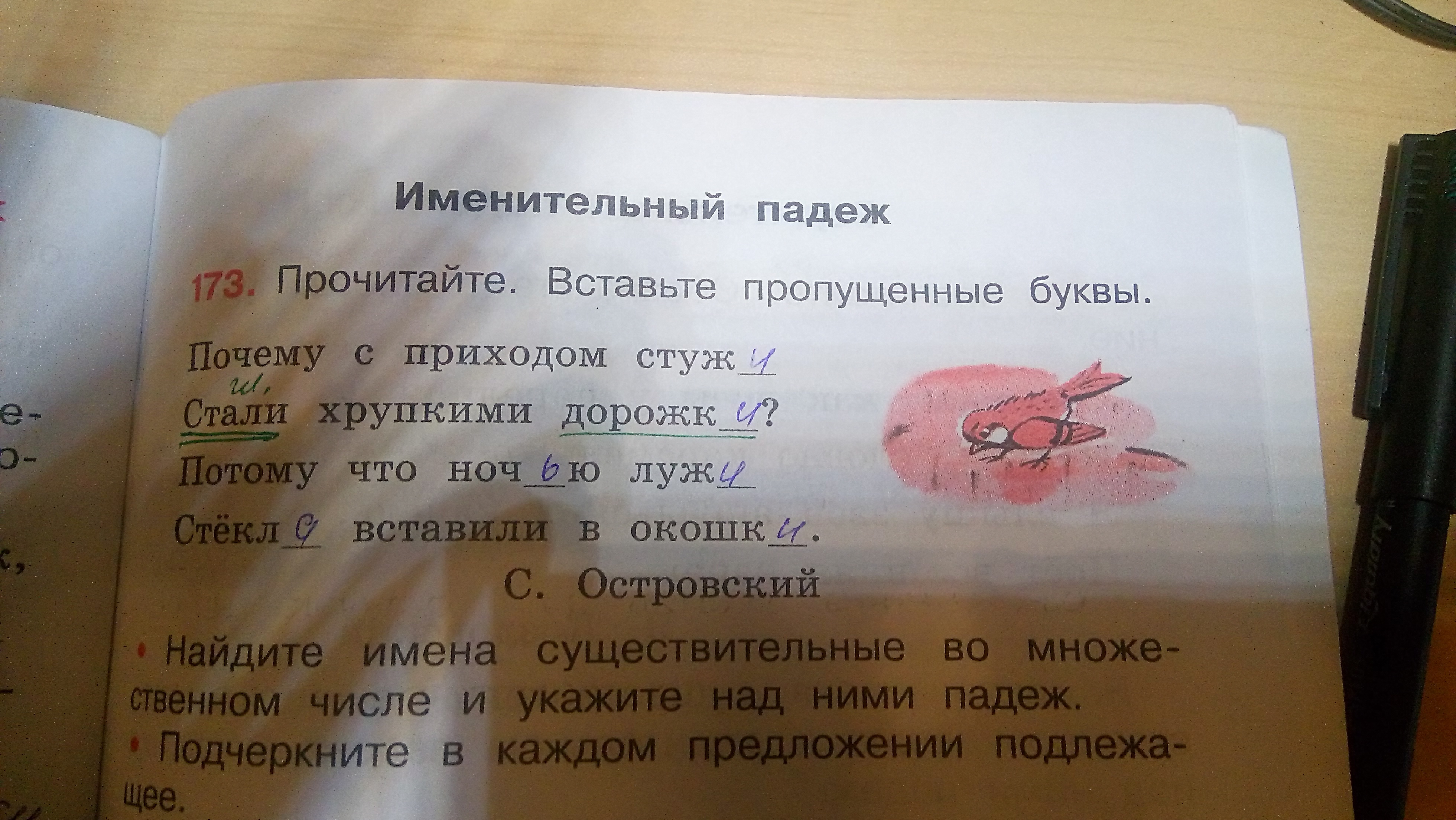 Вставьте буквы. Найдите имени существительные во множественном числе и укажите над ними падеж.