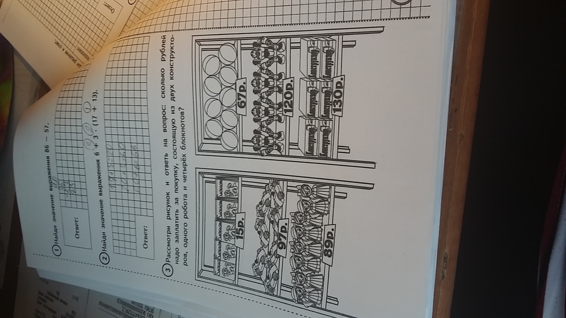 рассмотри рисунок и ответь на вопрос сколько рублей надо заплатить за покупку состоящую из двух конструкторов одного робота и четырех блокнотов?
