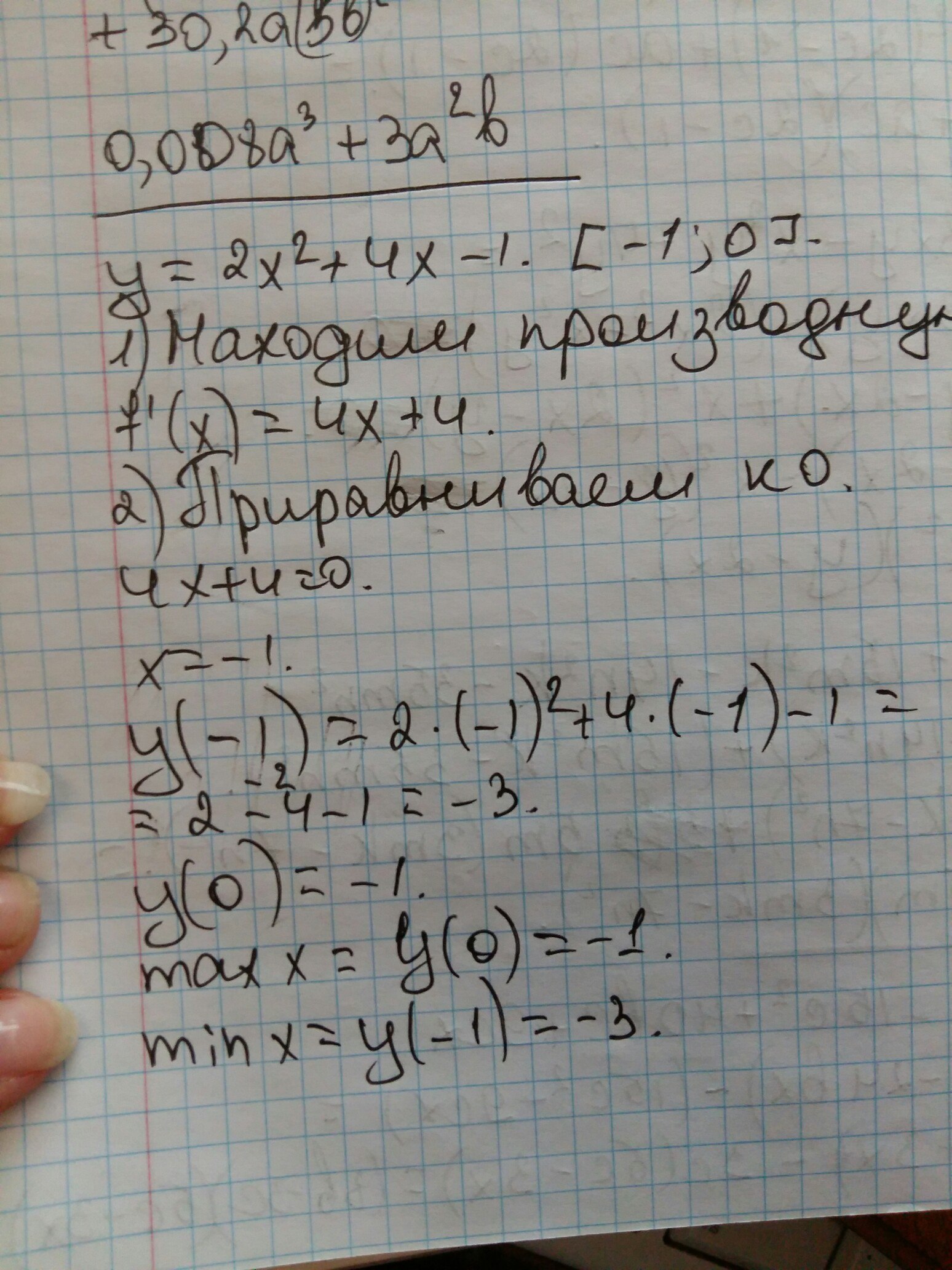 найдите наименьшее и наибольшее значение функции y=2x^2+4x-1 на отрезке [-1;0]
