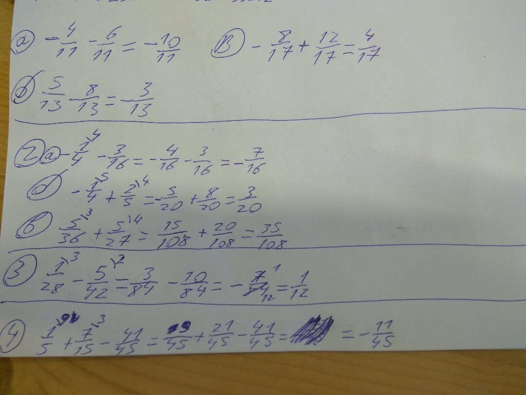 вычитал ие райиональных чисел. 1.а)-4/11-6/11;б)5/13-8/13;в)-8/17-(-12/17). 2. а)-1/4-3/16;б)-1/4-(-2/5);в)-5/36-(-5/27). 3. выполните вфчитание и упростите ответ:1/28-5/42. 4*найдите значение числового выражения 1/5-(-7/15)-41/45. помогите пожалуйста