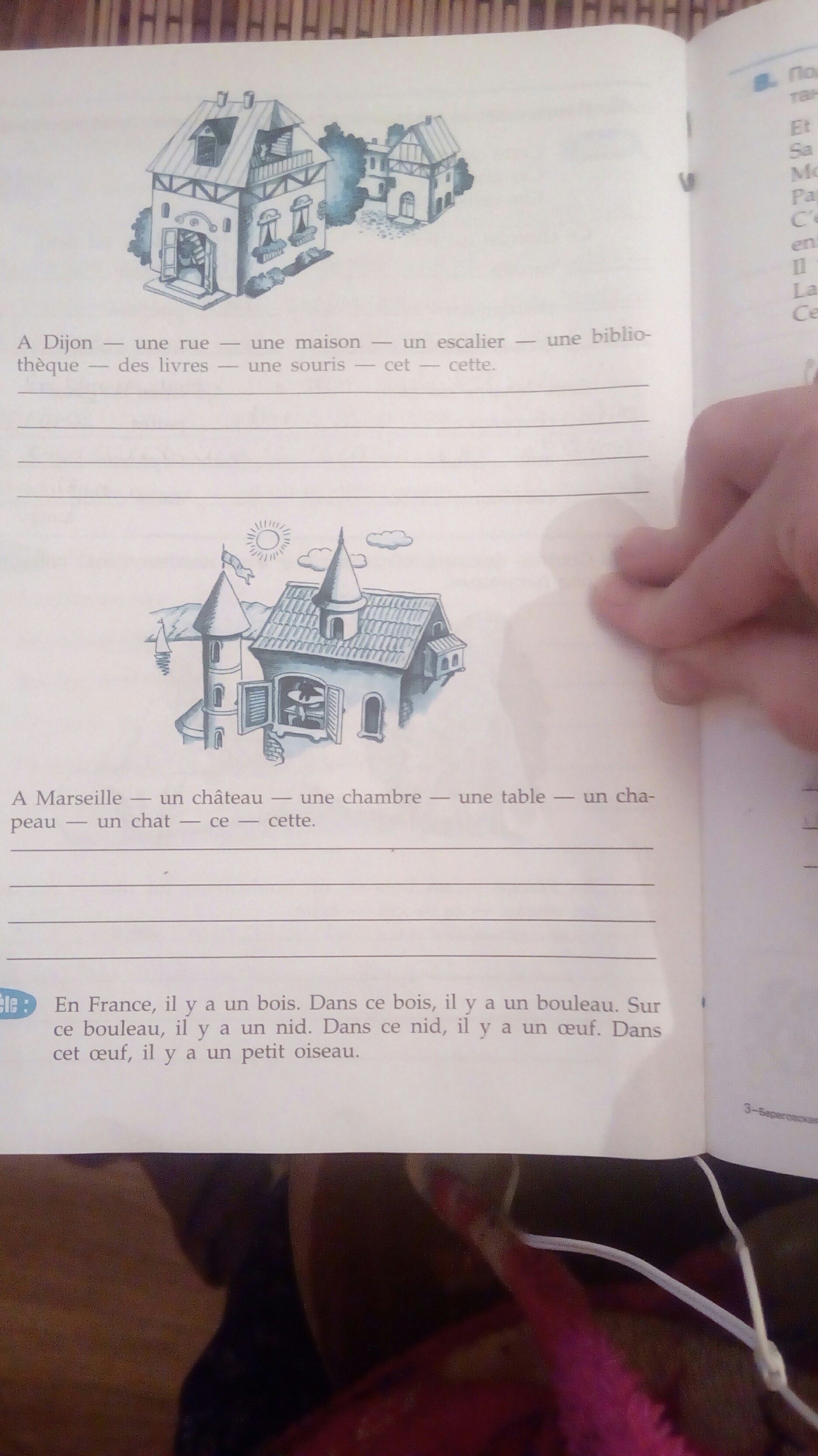 En Marseille il y a un château. Dans ce château il y a une chambre. Sur cette chambre il y a une table. Dans cette chambre il y a une table. Sur ce table il y a un chapeau. Dans ce chapeau il y a un chat.