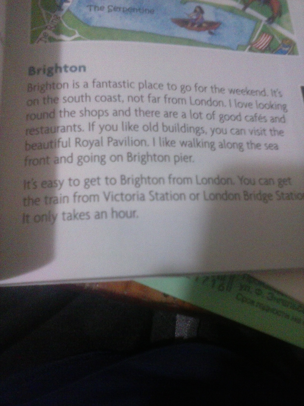 Брайтон - фантастическое место для проведения выходных. Он расположен не так далеко от Лондона - на южном побережье. Я люблю осматривать здесь магазины, и так же здесь немало хороших кафе и ресторанов. Если вам нравятся старые здания, вы можете посетить Королевский Павильон. Мне нравится прогуливаться вдоль морской набережной и ходить по Брайтонской пристани.
