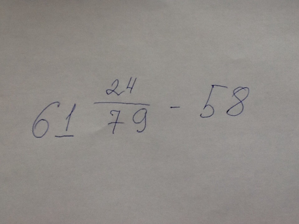 61/24-79/-58/=3 /24/79 .Отнимай от 61-58,будет 3.А те числа это дроби.Писал со палочками,так как невозможно написать дробь на планшете.Можно сократить 24/79=8/33 и того ответ=3 8/33