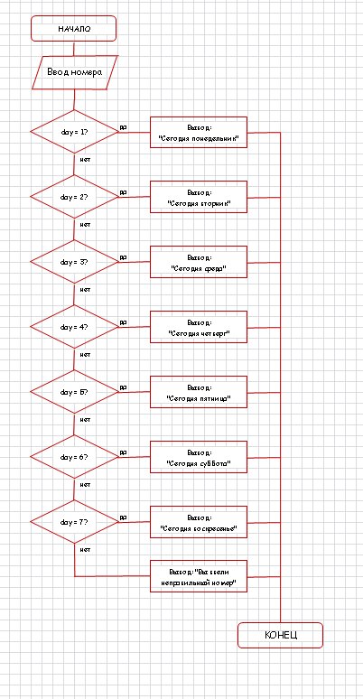 составить блок-схемы и программы на Паскале для решении задач: компьютер запрашивает номер дня недели, после ввода компьютер сообщает название этого дня.например, если ввели 1, то выдается фаза <> и т.д