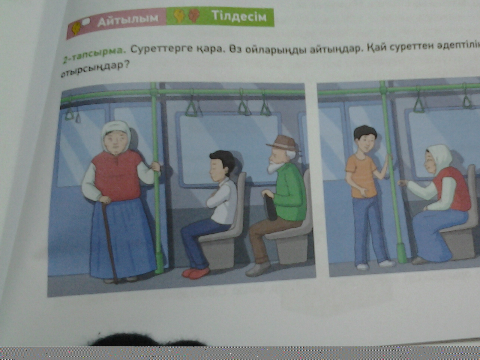 2 суреттегі ұл бала əжеге орын беріп сыпайылық танытып жатыр.