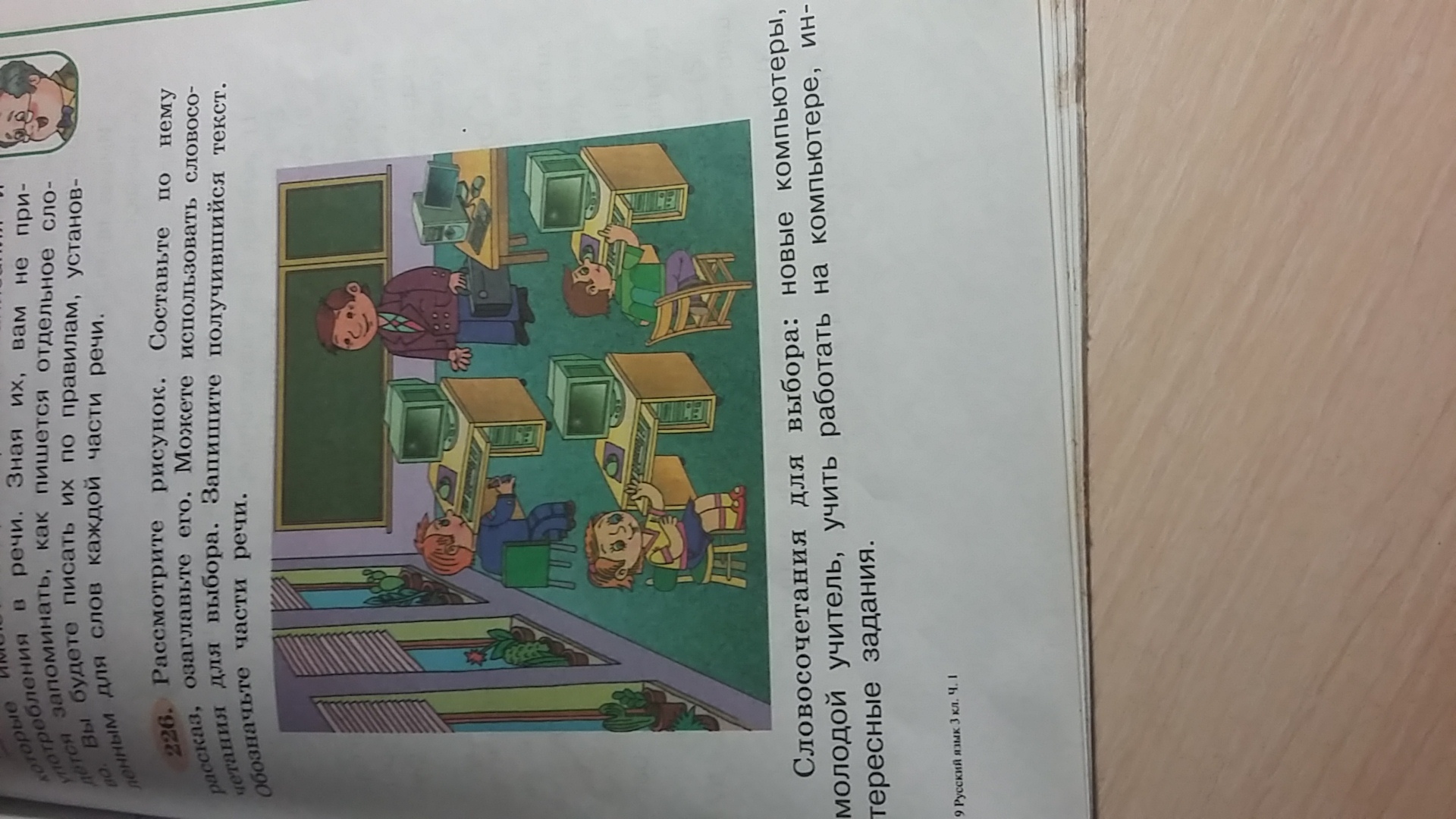 рассмотри рисунок.составь по нему рассказ и озоглавь его.можете использовать словосочетания для выбора.запишите получившийся текст.обозначьте части речи.словосочетание для выбора:новые компьютеры,молодой учитель,учит работать на компьютере, интересные задания.