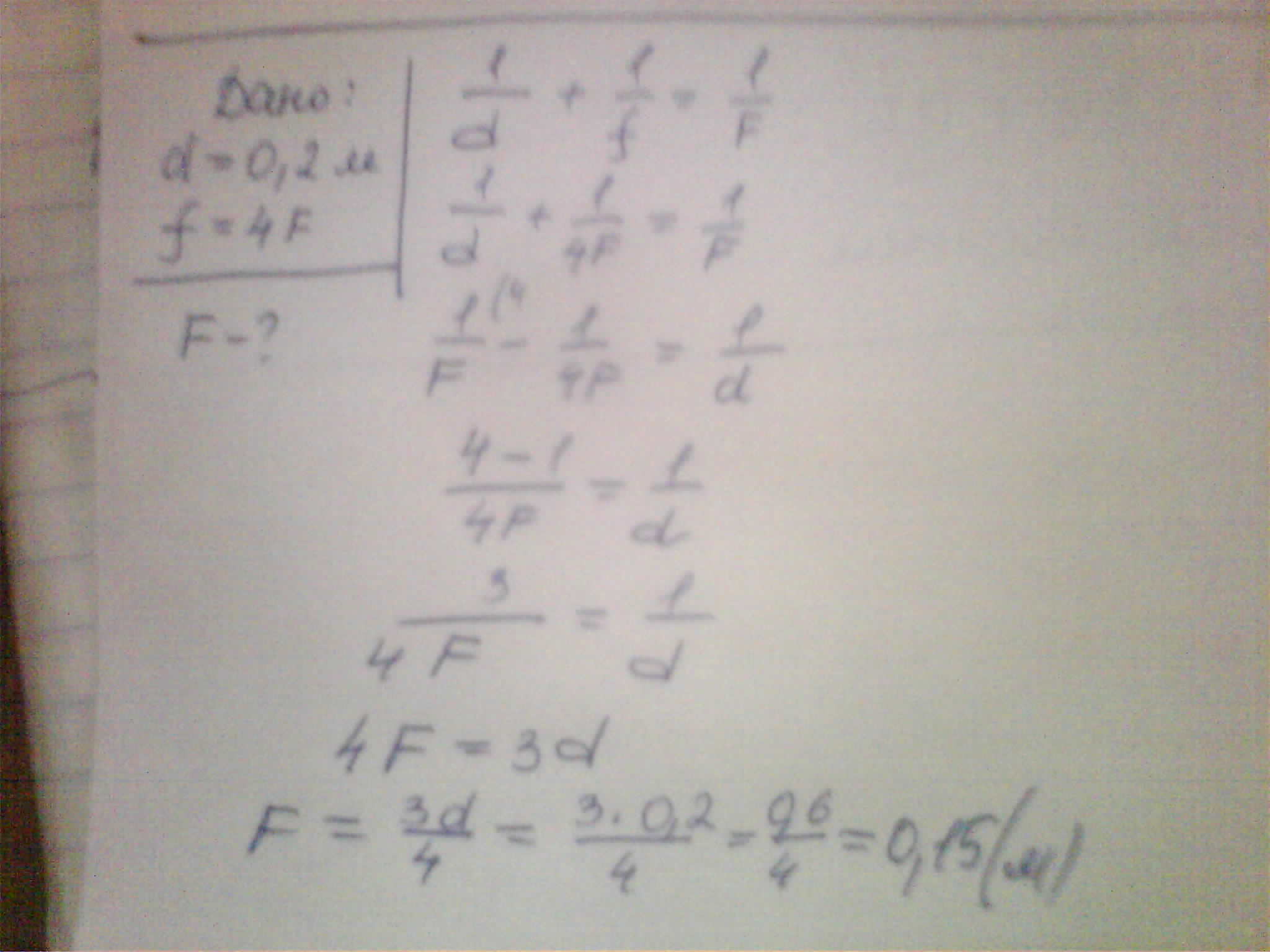 Предмет расположен на главной оптической оси собирающей линзы на расстоянии d=20 см от неё. Елси действительное изображение предмета получено на расстоянии 4F от линзы (F-фокусное расстояние), то величина F равна?