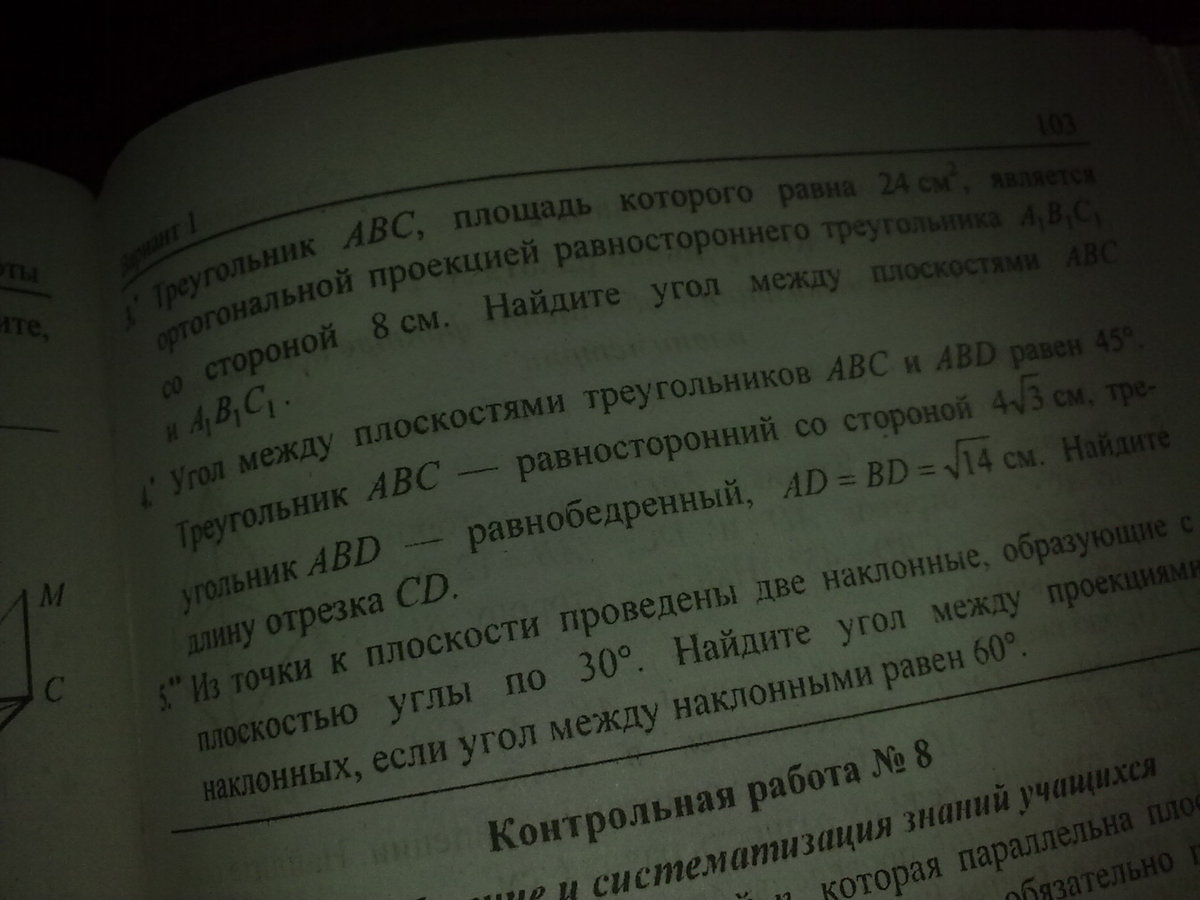 треугольник ABC,площадь которого равна 24 см2,является ортогональной проекцией равностороннего треугольника A1B1C1 cо сторонами 8 см.Найдте угол между плоскостями ABC и A1B1C1