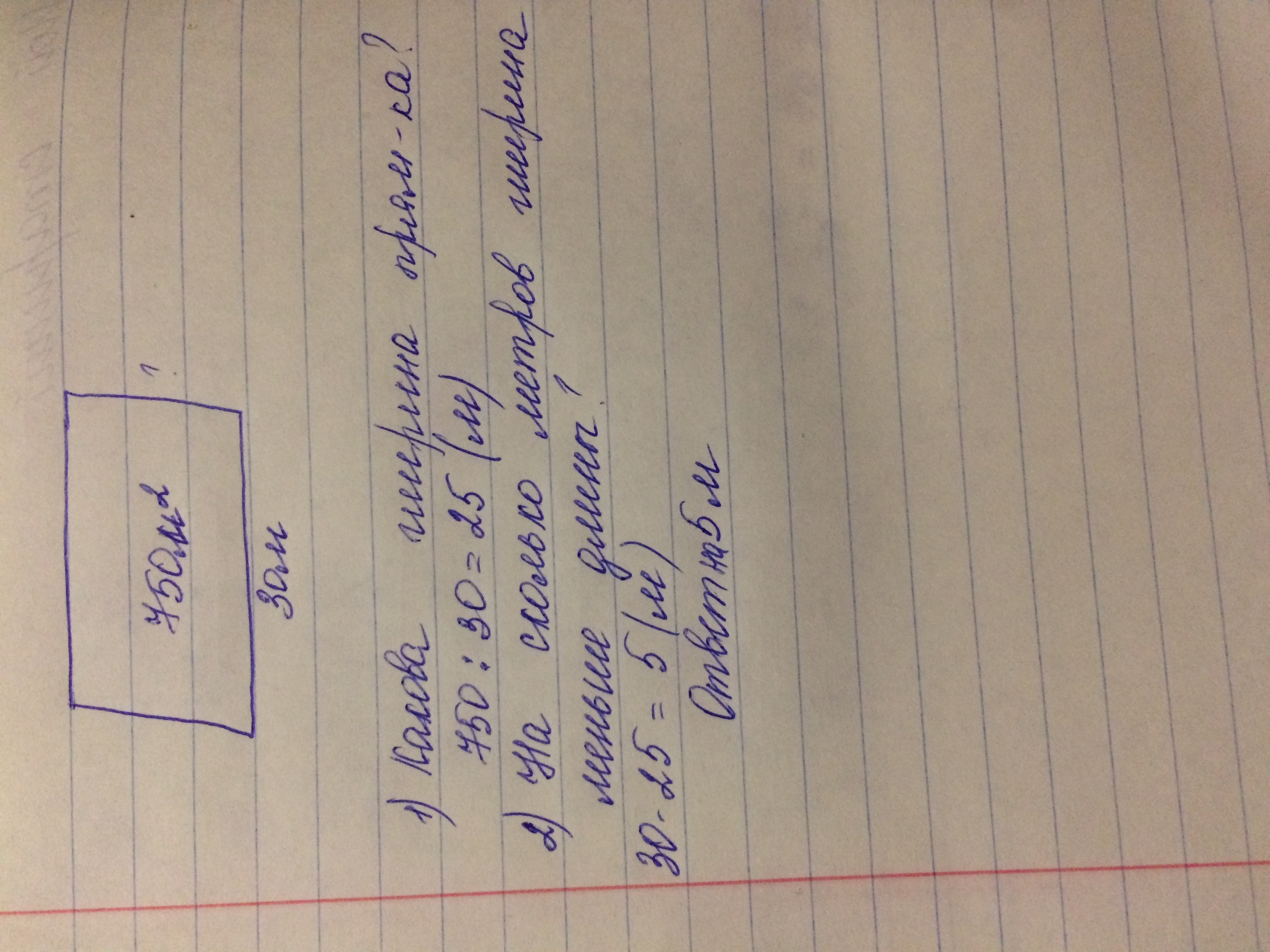 Площадь прямоугольника равна 750 квадратных метров а длина 30 метров на сколько метров ширина прямоугольника меньше длины