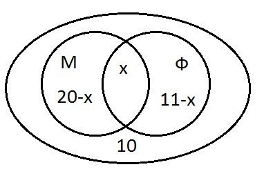 Пусть х - посещают и физический и математический кружки, тогда только математический - (20-х), а только физический (11-х).