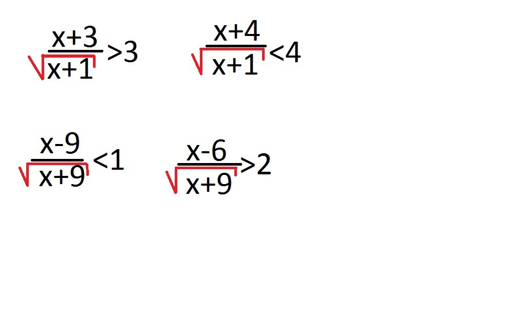 4)quad  frac{x-6}{sqrt{x+9}}  textgreater  2; ,; ; ; ODZ:; x textgreater  -9\\ frac{x-6-2sqrt{x+9}}{sqrt{x+9}}  textgreater  0; ; to ; ; x-6-2sqrt{x+9} textgreater  0\\2sqrt{x+9} textless  x-6; ; Leftrightarrow ; ;  left { {{x+9 textgreater  0; ,; x-6 textgreater  0} atop {4(x+9) textless  (x-6)^2}} right. \\ left { {{x textgreater  -9; ,; x textgreater  6} atop {4x+36 textless  x^2-12x+36}} right. ;  left { {{x textgreater  6} atop {x^2-16x textgreater  0}} right. ;  left { {{x textgreater  6} atop {x(x-16) textgreater  0}} right. ;  left { {{x textgreater  6} atop {x textless  0; ili; x textgreater  16}} right. ; Rightarrow \\xin (16,+infty ); -; otvet