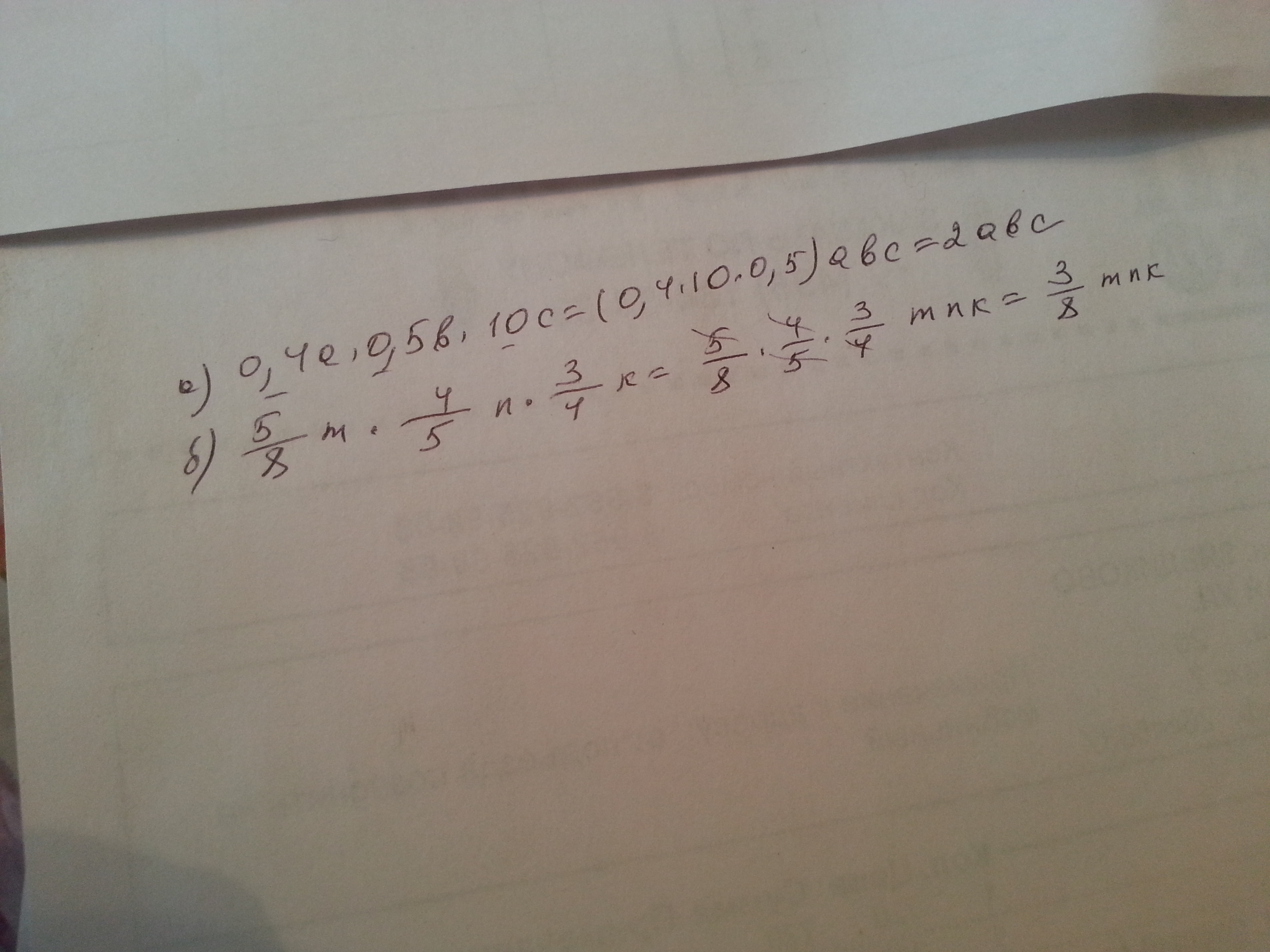 Упростите выражение:а)0,4а×0,5b×10c;б)5/8m×4/5n×3/4k.Пожалуйста
