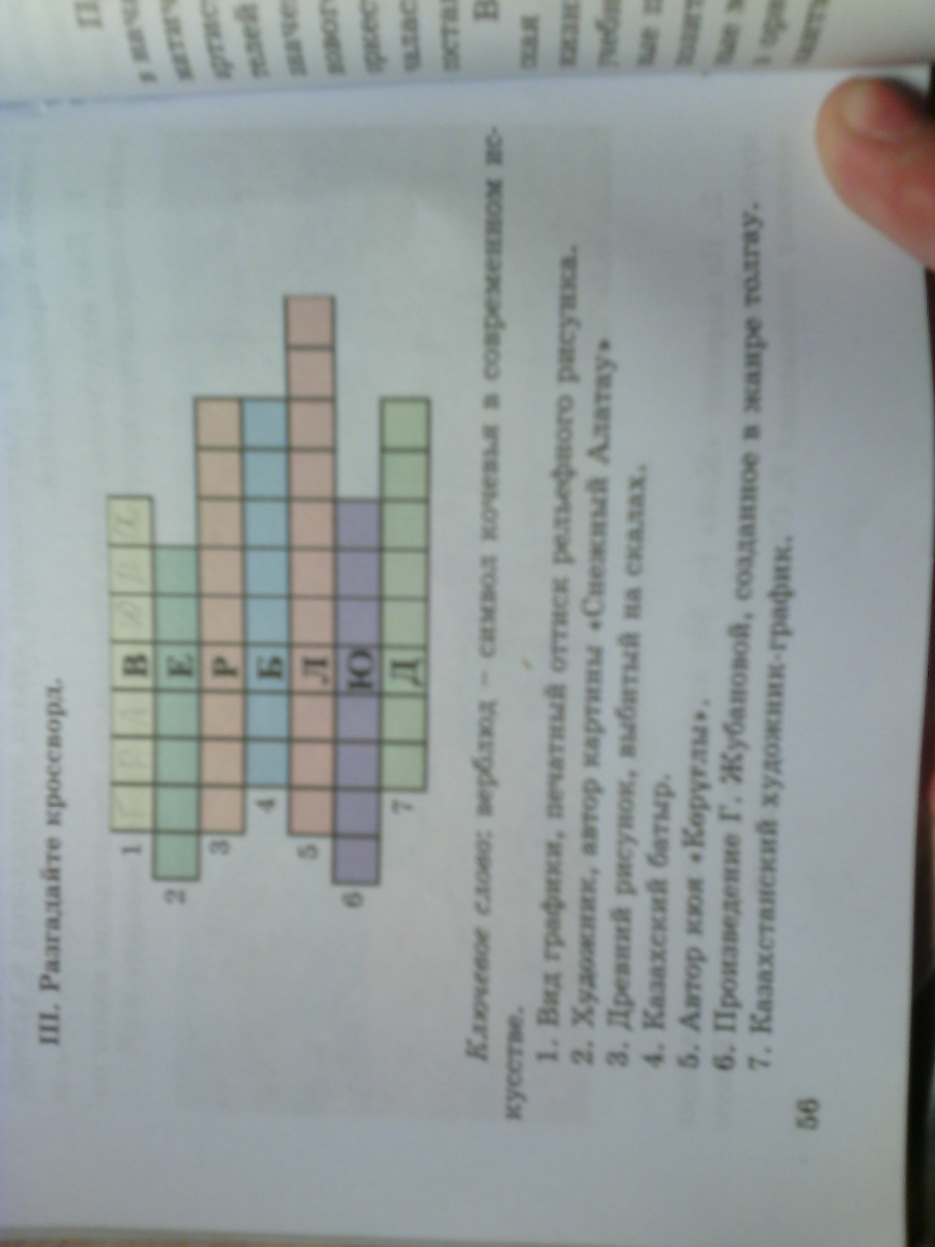 1-гравюра,2-?.,3-петроглиф,4-кабанбай,5-даулеткерей,6-?,7-сидоркин.Вот какие знала