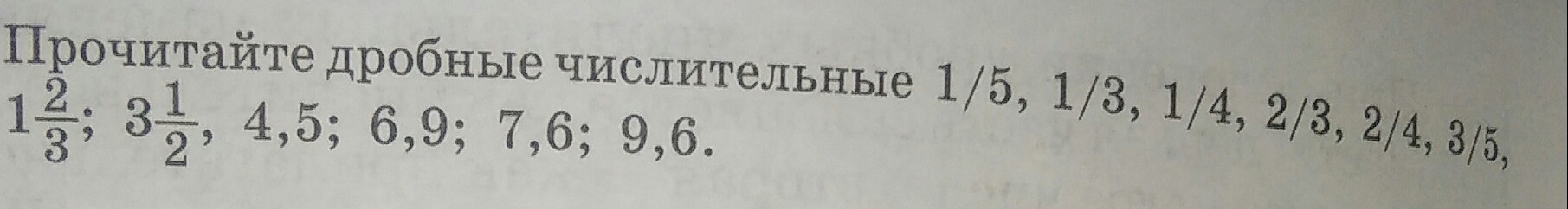 одна пятая,одна третья, одна четвёртая, две третьих, две четвертых, три пятых, одна целая две третьих, три целых одна вторая, четыре целых пять десятых, шесть целых девять десятых, семь целых шесть десятых, девять целых шесть десятых