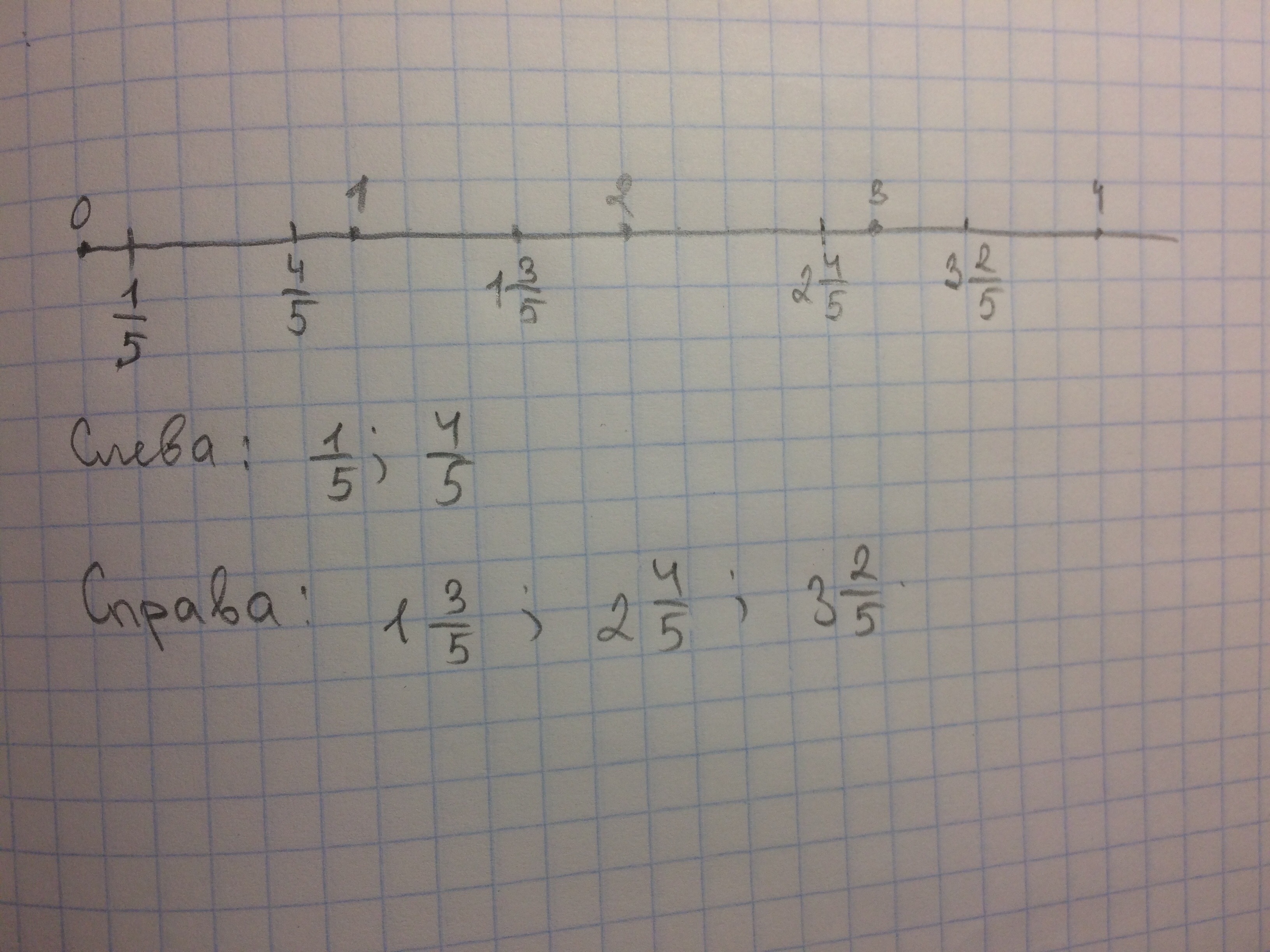 На черти координатный луч, за единичный отрезок примите длину 5 клеток тетради. Отметьте на координатном луче точки, которым соответствуют числа одна пятая,четыре пятых,одна целая три пятых,две целых четыре пятых,одна целая три пятых,три целых две пятых. Какие числа будут изображены слева от точки, соответствующей числу 1, какие-справа? Помогите срочно очень
