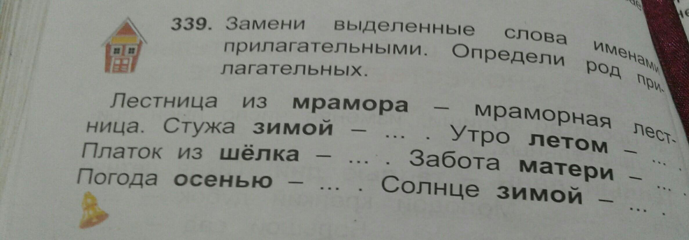 Замените подчёркнутые слова именами прилагательными. Лестница из мрамора, стужа зимой, утро летом, платок из шёлка, забота матери, следы зверей, руда из свинца, погода осенью, солнце зимой, статуя из бронзы, лапы ели, листья из золота, каша из перловки, тигр в плоску.