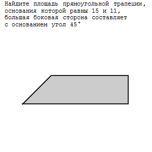 Найдите площадь прямоугольной трапеции, основания которой равны 15 и 11 , большая боковая сторона составляет с основанием угол 45