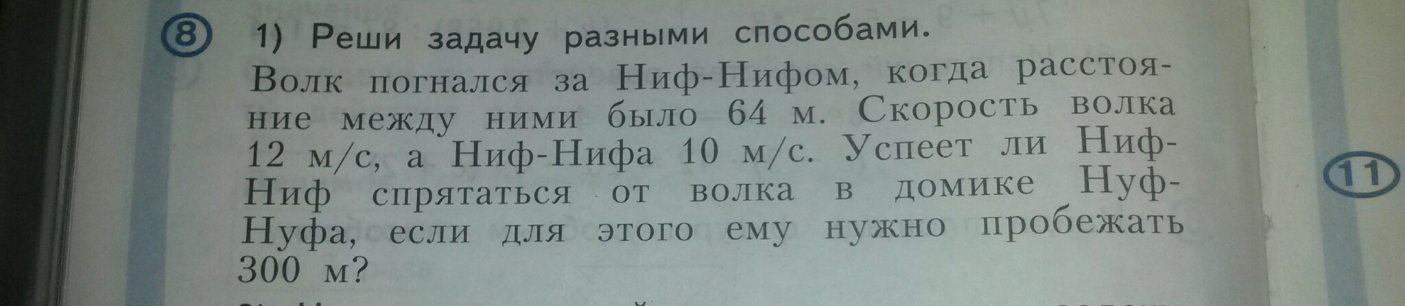 Помогите решить 2-мя способами по действиям например 1)30:10=3(мс)-скорость Ниф-Нифа