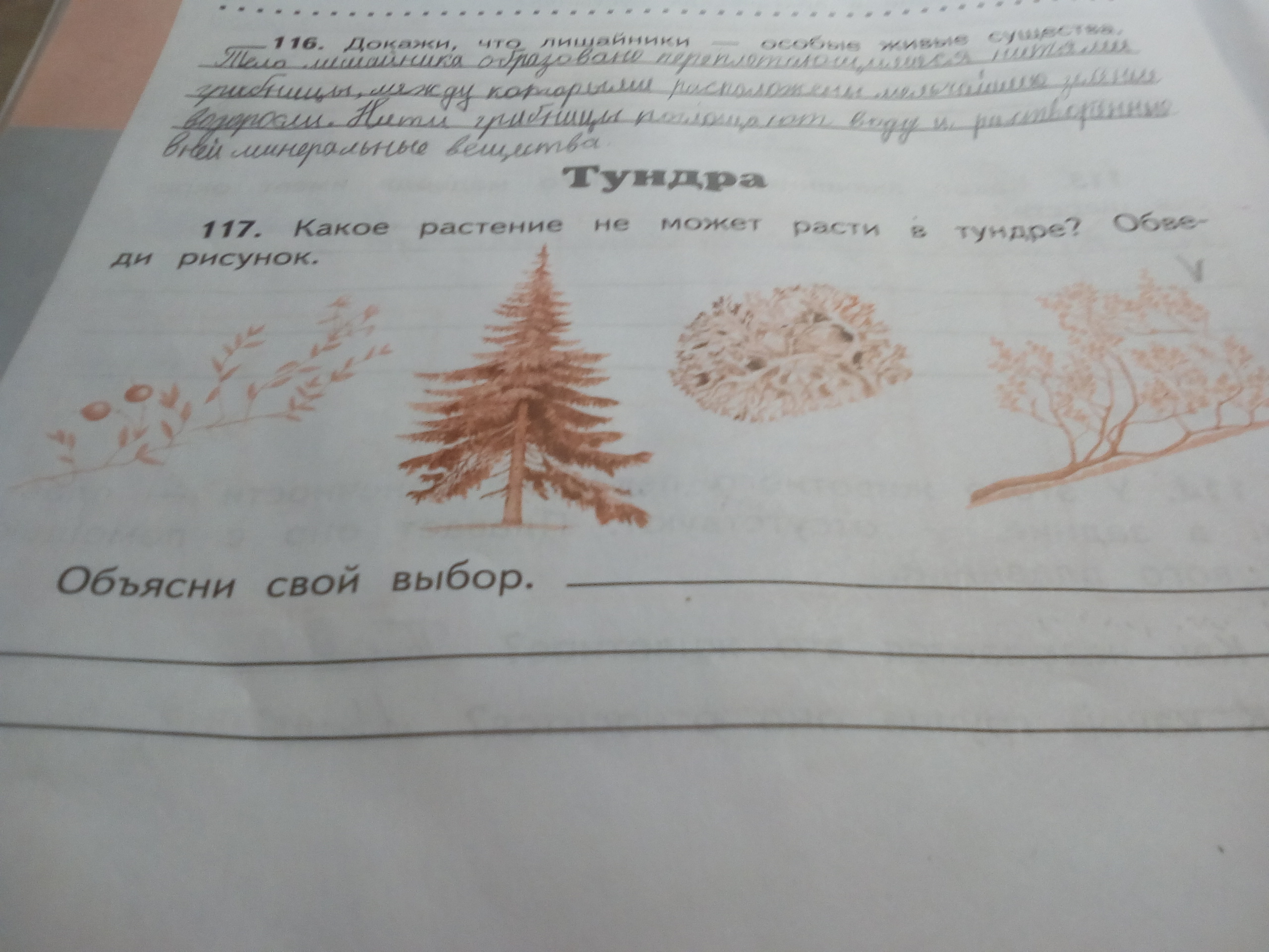 Помогите решить номер 117. Позалуйста буду очень благодарна? Вопрос: какое растение не может расти в тундре? Обведи рисунок. ( и пониже) Обясни с вой выбор:
