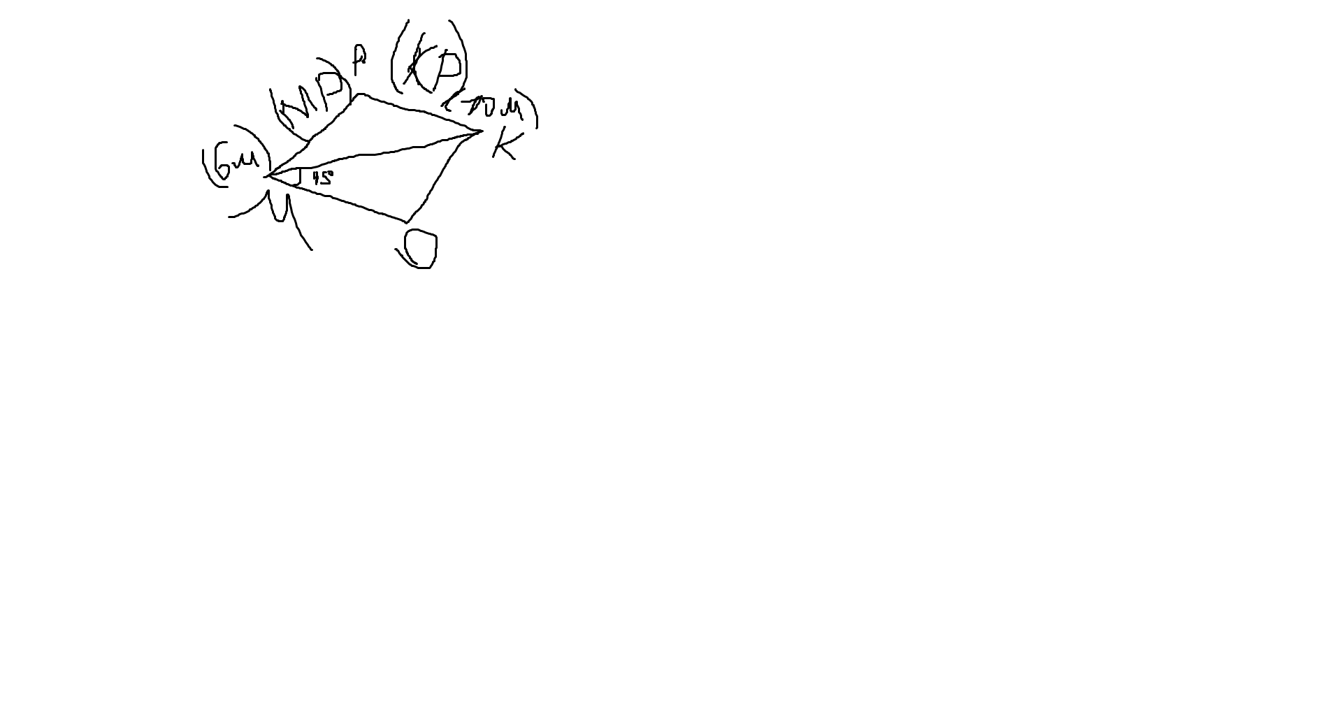 найти площадь параллелограмма ompk если сторона kp равна 10м а сторона mp равная 6м составляет с диагональю mk угол равный 45 градусам.