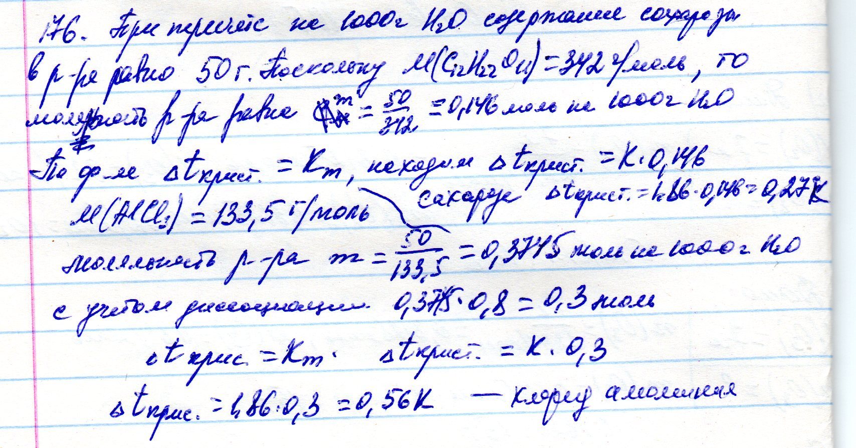 176. Вычислите, как различаются температуры замерзания 5%-ных водных растворов сахара С12Н22О11 и хлорида алюминия, если степень диссоциации соли равна 80%-ной.