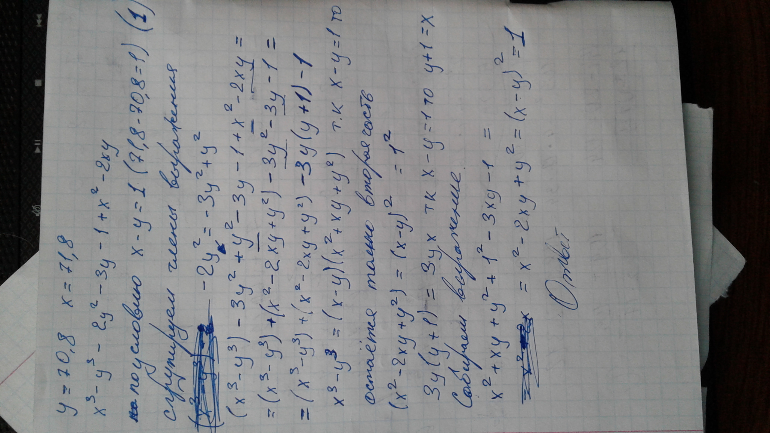 х²+ху+у²-2у²-3у-1+х²-2ху=(х²-2ху+у²)+ху-2у²-3у-1+х²=1+ху-2у²-3у-1+х²=х²+ху-2у²-3у=(х²-2ху+у²)+3ху-3у²-3у=1+3ху-3у²-3у=1+3у(х-у-1)=1+3*70,8(71,8-70,8-1)=1+3*70,8*0=1