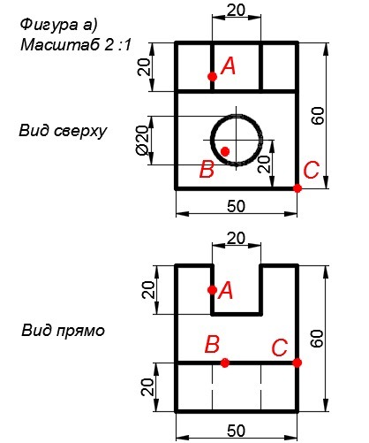 По заданию учителя по наглядному изображению деталей выполните чертеж одной из них в необходимом количестве видов в масштабе 2:1 нанесите на всех видах обозначьте точки А В С