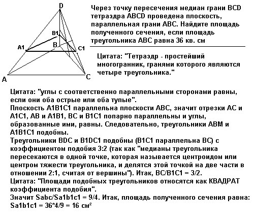 Через точку пересечения медиан грани BCD тетраэдраABCD проведена плоскость, параллельная грани ABC. Найдите площадь полученногосечения, если площадь треугольника ABC равна 36 кв. см