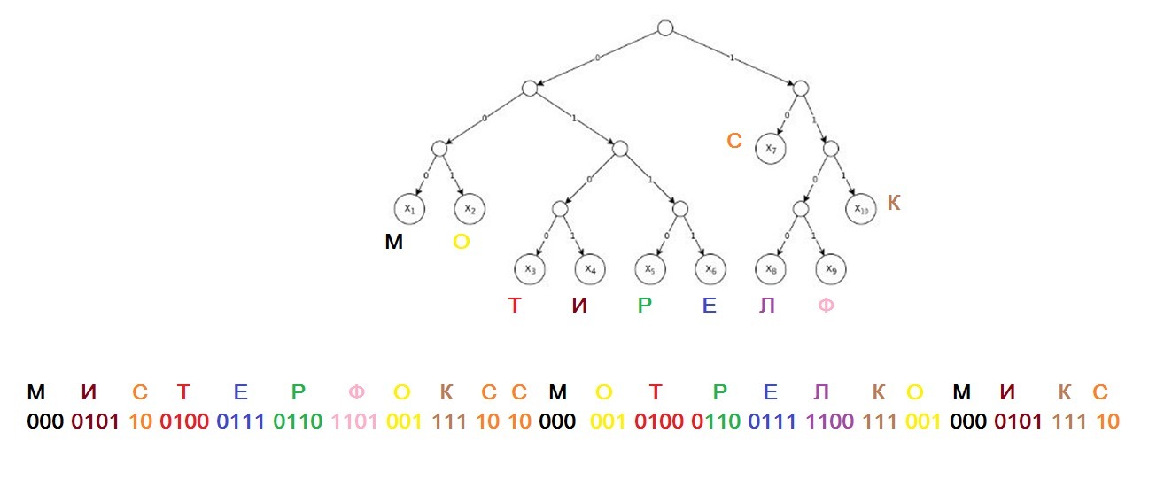 Будем использовать кодирование с помощью дерева, в листьях которого написаны буквы, а на каждом ребре — либо 0 либо 1 (см. рисунок). Чтобы закодировать букву, нужно пройти по дереву от корня до этой буквы, записав все цифры на ребрах этого пути. Мы закодировали фразу “мистерфокссмотрелкомикс” и получили последовательность: