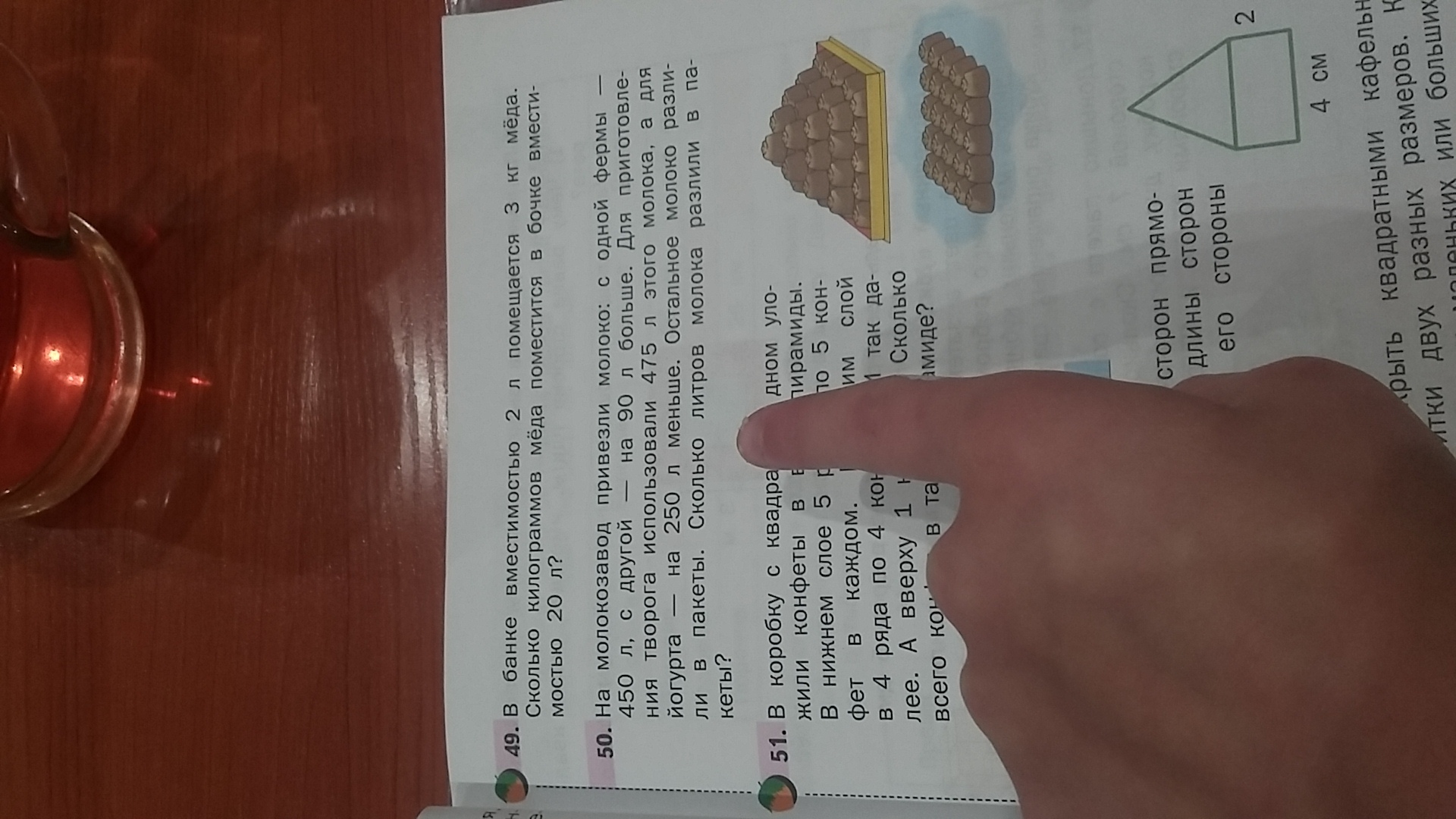 3 класс На молокозавод привезли молоко: с одной фермы 450 л. с другой на 90 л. больше.Для приготовления творога использовали 475л. этого молока а для йогурта на 250 л. меньше.Остальное молоко разлили в пакетя. Сколько литров молока разлили в пакеты. Пожалуйста помогите мне номер 50