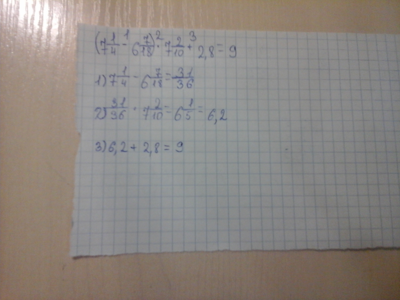 плиз плиз помогите срочно пример решите. (7 целых одну четвертую минус 6 целых семь восемнадцатых ) умножить на 7 целых две десятых это все смешанные дроби а потом прибавьте 2,8
