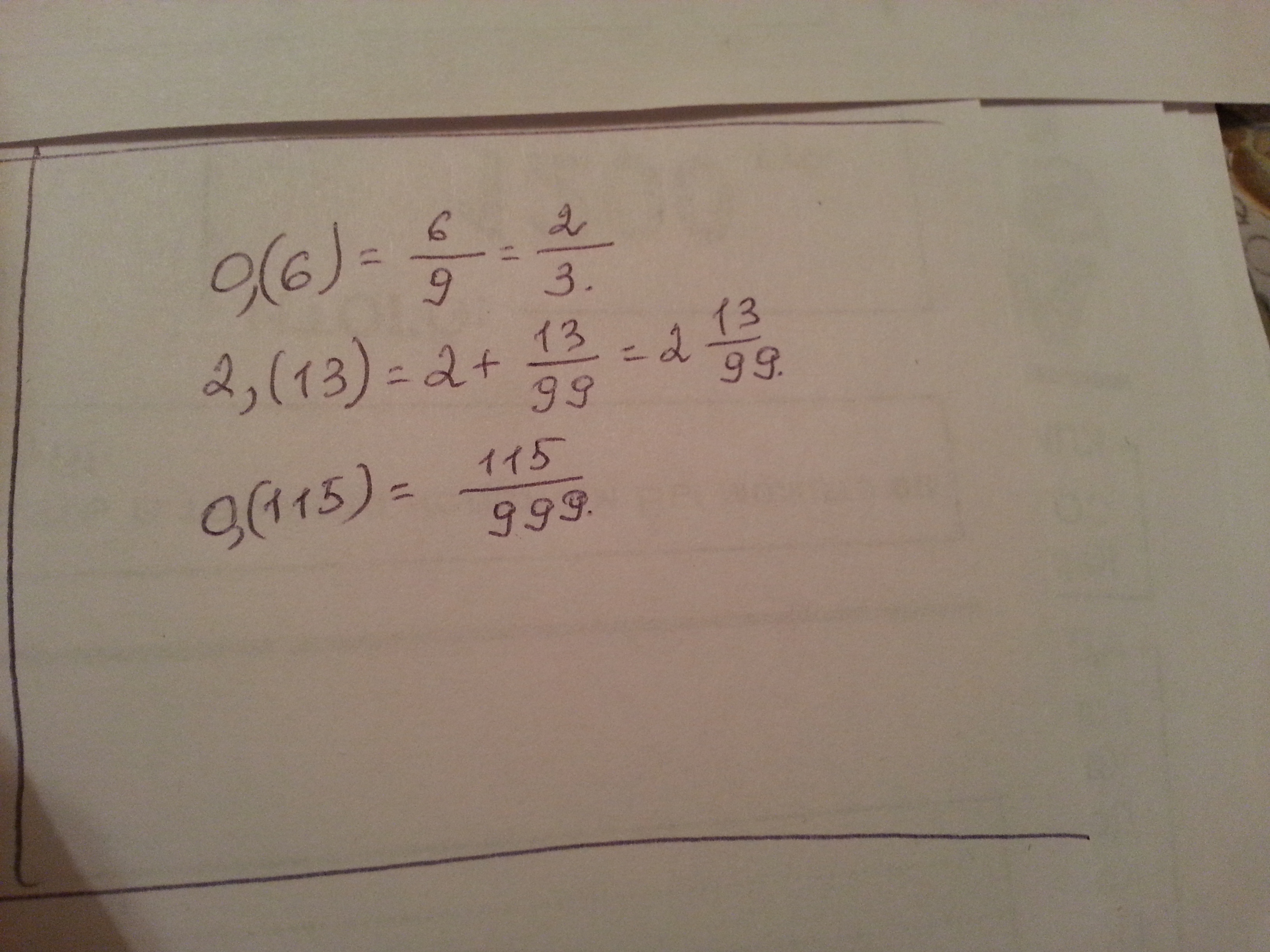 а) 0,(6); б) 2,(13) в) 0,(115) -выразите бесконечные периодические десятичные дроби через обыкновенные дроби