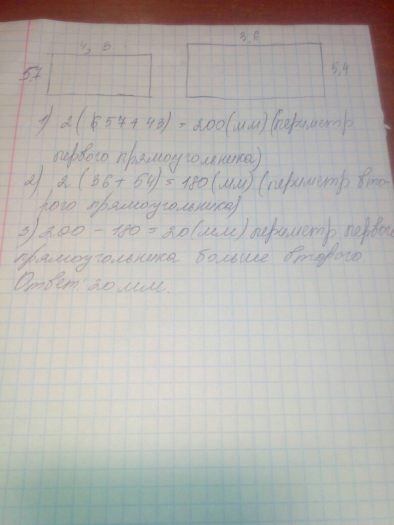 Построй два прямоугольника: один со сторономи 4см 3мм и 5см 7мм, а другой со стронами 3см 6мм и 5см 4мм. На сколько периметр одного прямоугольника больше периметра другого прямоугольника? Пожааалуйста помогите=(
